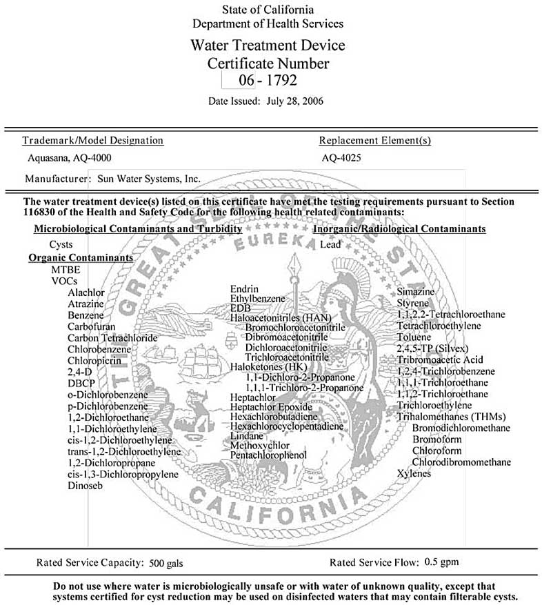 Click the links on the bottom of this page for Aquasana‘s Performance Data Sheet‚ Department Of Health Certification and the Product Comparison Chart. This information documents the effectiveness of the Aquasana Drinking Water Enhancement System and how it compares to other leading brands.